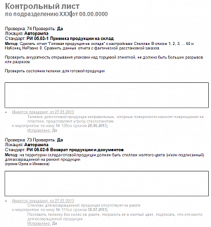 - Решение позволяет создавать контрольные листы в соответствии с существующими стандартами (регламентами, инструкциями) в виде списка последовательных проверок с указанием для аудитора места проверки, метода проверки, а так же списка прецедентов по каждой проверке. Список прецедентов в контрольном листе позволят на месте понять произошло исправление или нет, а так же оценить эффективность примененного ранее корректирующего или предупреждающего мероприятия;