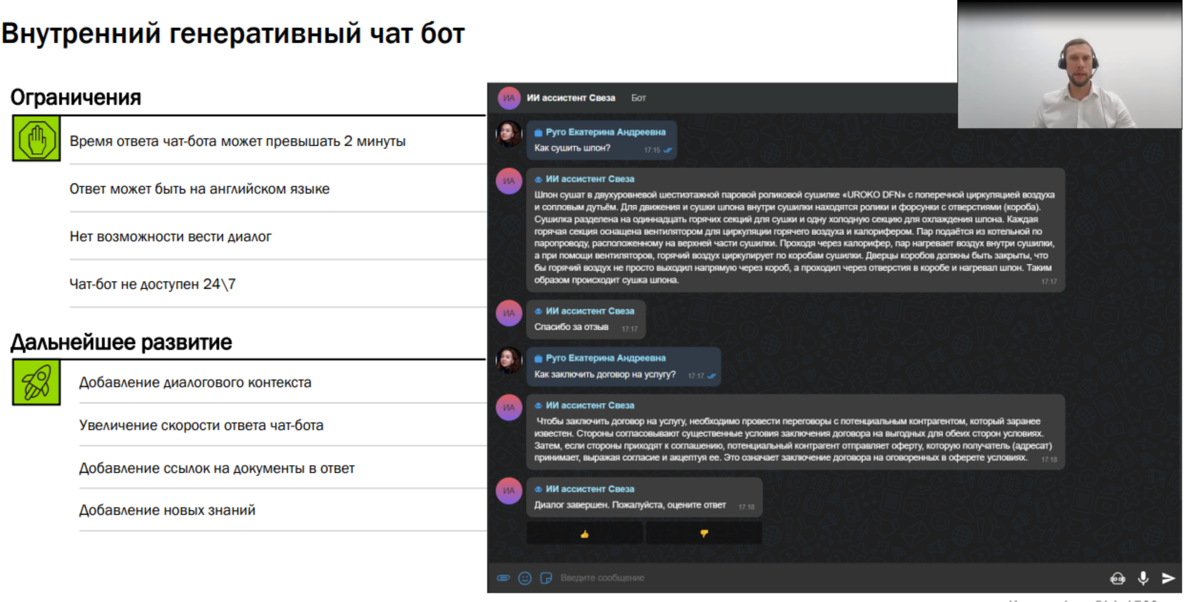 Виталий Гришин присоединился к конференции онлайн и рассказал о внедрении в компании ГК «Свеза» таких ИТ-инструментов, как дашборды для комплексной оценки процессов, BPM-платформы для управления и автоматизации, а также чат-бота с ИИ для работы с нормативными документами.