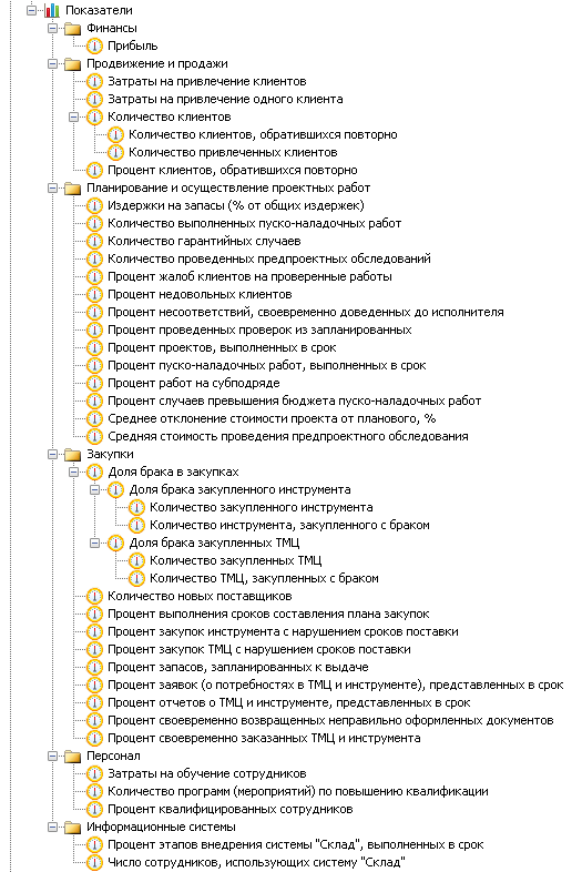 Показатели хранятся в справочнике "Показатели". Показатели могут быть сгруппированы по папкам или по показателям, рассчитываемым на основе других показателей (Рис. 4).