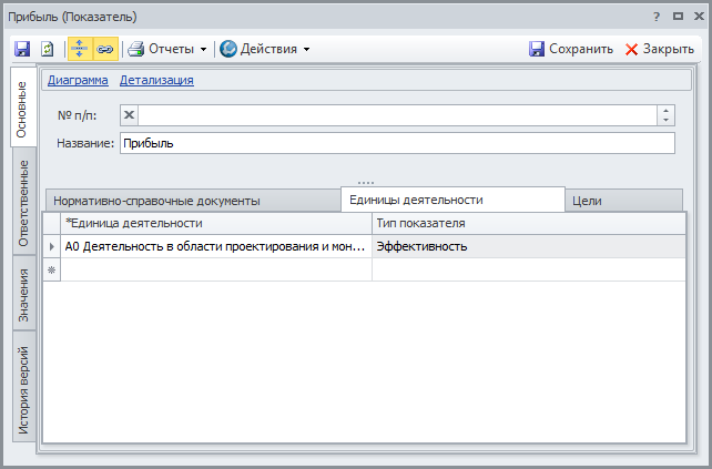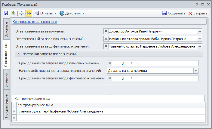 В Окне свойств показателя на вкладке Ответственные представлены параметры, обозначающие ответственных должностных и/или физических лиц по отношению к показателям.