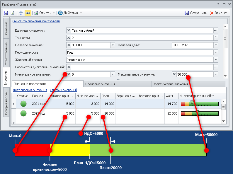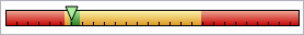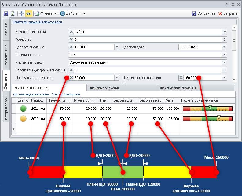 Цветовая индикаторная линейка отображает положение фактического значения показателя в интервале между минимальным и максимальным значениями. Линейка разделена на несколько зон: зеленая, желтая, красная. Фактическое значение в Зеленой зоне не требует внимания ответственных лиц. Фактическое значение в Желтой зоне требует внимания ответственных лиц. Фактическое значение из Красной зоны требует проведение немедленных корректирующих действий.