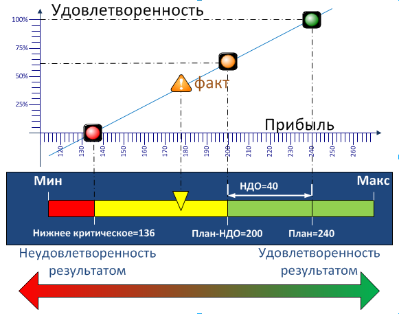 Фактическое значение в Зеленой зоне не требует внимания ответственных лиц. Для показателя "Прибыль" зеленая зона – это отрезок [Плановое значение – Нижнее допустимое отклонение; Максимальное значение].