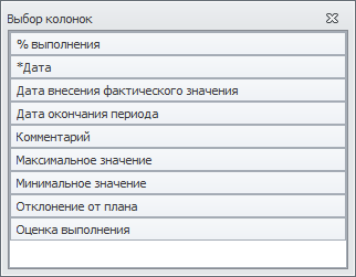 С помощью пункта контекстного меню Выбор колонок, вызванного от заголовка таблицы, в перечень параметров, отображаемых по умолчанию на вкладке Значения показателя можно вывести на показ для анализа параметры, приведенные в окне Выбор колонок (Рис. 2).