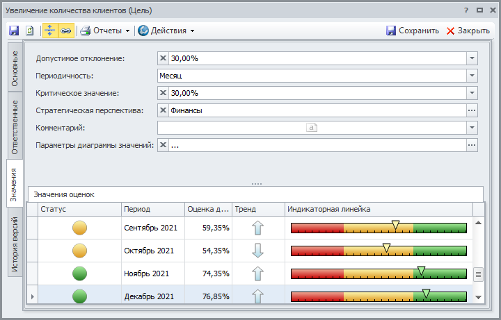 Для наглядности значения оценки достижения цели отображаются на индикаторной линейке, которая демонстрирует оценку достижения стратегической цели за период.
