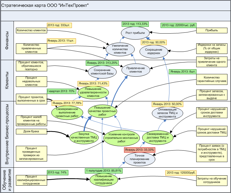 На стратегической карте цели изображаются в виде овала, показатели - в виде прямоугольника. Связи между целями, а также между целями и показателями изображаются в виде стрелок. Толщина стрелки отражает силу влияния.