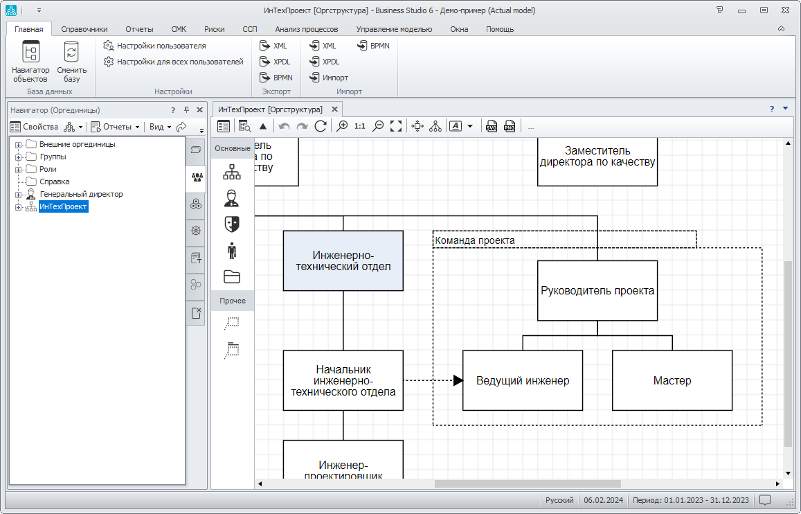 На организационной диаграмме можно моделировать различные связи между оргединицами. Например, на Рисунке 1 изображено, что оргединица "Ведущий инженер" иерархически подчиняется оргединице "Руководитель проекта", но в то же время функционально подчиняется оргединице "Начальник инженерно-технического отдела".