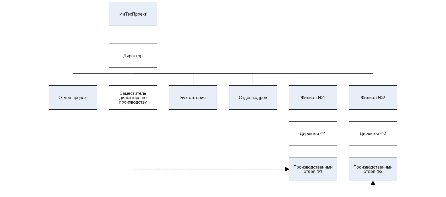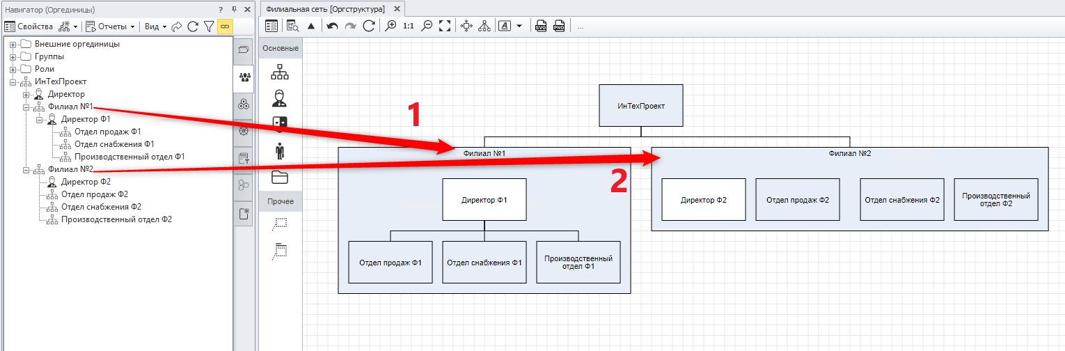 Моделировать связи между оргединицами на диаграмме можно с помощью вложенности одних фигур в другие. На рисунке 2 приведены примеры подходов к моделированию иерархии оргструктуры. На данной диаграмме представлена структура филиальной сети «ИнТехПроект». Она состоит из «Филиал №1» и «Филиал № 2».