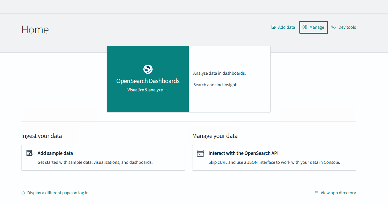 1. Перейдите на домашнюю страницу OpenSearch Dashboards. Это можно сделать, нажав на логотип в левом верхнем углу интерфейса.