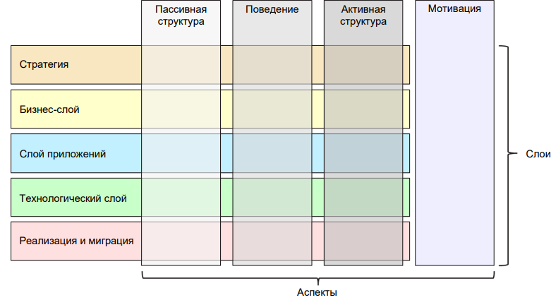 Слои подразделяются на стратегический, бизнес, приложений, технологический и реализации и миграции. Аспекты включают аспект активной структуры, аспект поведения и аспект пассивной структуры. Например, аспект активной структуры содержит структурные элементы, демонстрирующие активное поведение, такие как бизнес-акторы, компоненты приложений и устройства. Аспект поведения включает элементы поведения, такие как процессы, функции, события и сервисы. Аспект пассивной структуры содержит объекты, над которыми осуществляется поведение, такие как информационные объекты бизнес-слоя и объекты данных слоя приложений.