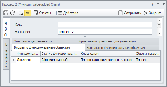 На рисунке 9 изображена передача объекта «Документ» со статусом «Сформированный» из Процесса 1 в Процесс 2. При этом в системе автоматически формируются списки входов-выходов для Процесса 1 и Процесса 2. «Документ» является выходом Процесса 1 (рисунок 10) и входом Процесса 2 (рисунок 11).