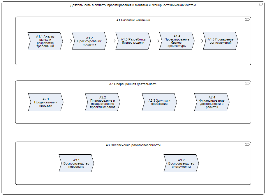 На Рисунке 1 показан пример диаграммы процесса в нотации VAD. Нотация позволяет отобразить несколько уровней функций/процессов на одной диаграмме.