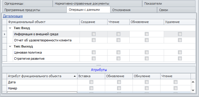 Для каждой единицы деятельности заполняется вид операции с функциональным объектом. Под видом операции с функциональным объектом понимается то, каким образом единица деятельности воздействует на объект и его атрибуты. В программе предопределены следующие виды операций с функциональными объектами: создание, удаление, чтение и обновление; виды операций с атрибутами функциональных объектов: вставка, обновление, чтение, обнуление.