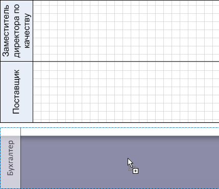 Для изменения ширины дорожки выделите её и подвиньте значок на боковой грани заголовка (подробнее о графической трансформации объектов на диаграмме см. Графическая трансформация фигур на диаграмме). Высоту поля заголовка дорожки также можно изменить, передвигая значок на верхней или нижней грани заголовка. При изменении высоты заголовка одной дорожки меняется высота заголовка всех других.