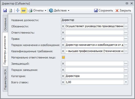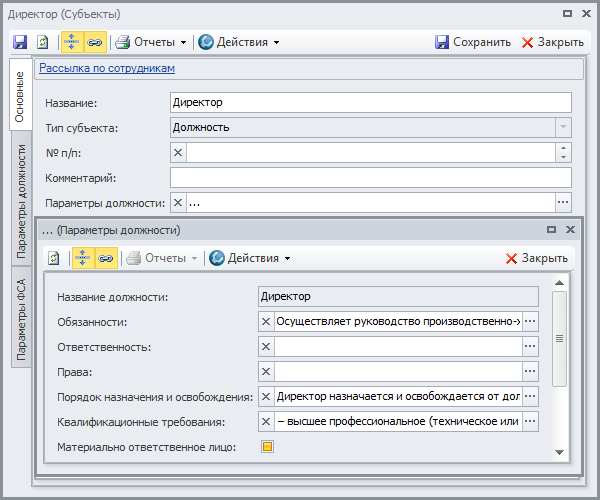 Параметр с типом "Структура" содержит набор параметров, объединенных по какому-либо признаку. Например, это "Параметры должности" оргединицы. Окно с параметрами, объединенными в параметр типа "Структура", можно открыть, нажав на кнопку