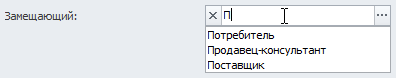 Затем ввести набор символов, с которого начинается название объекта справочника. Откроется выпадающий список, в котором будут перечислены все объекты справочника, удовлетворяющие заданному условию. Выберите объект, нажав по его названию мышью, или с помощью клавиатуры. Если нужное значение не показано в списке, нажмите по строке с названием "Другие…". Будет открыт справочник с отфильтрованным списком объектов, название которых начинается с заданных символов. Если заданному условию удовлетворяет только один объект справочника, то значение будет подставлено в поле автоматически.