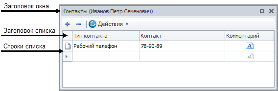 Значением параметра с типом "Список" является список строк, каждая из которых, в свою очередь, может состоять из набора параметров других типов. Например, значением параметра "Контакты" может быть список, состоящий из типов контактов: рабочий и домашний телефон, мобильный телефон. Причем каждая строка списка состоит из параметров: