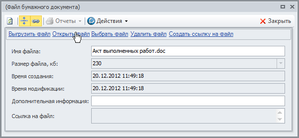 в строке параметра или дважды нажав левой кнопкой мыши по этой строке. Для работы с файлом в Окне свойств (Рис. 15) используются гиперссылки Выгрузить файл, Открыть файл, Выбрать файл, Удалить файл, Создать ссылку на файл.