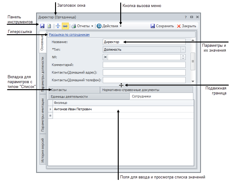 Заголовок окна содержит название объекта, свойства которого открыты в окне, и название справочника, в котором хранится объект. Название справочника отображается в скобках.