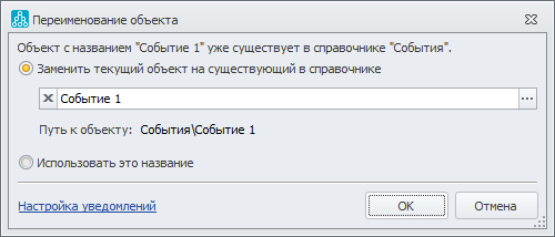 В Настройках пользователя в параметре Настройки уведомлений можно включить уведомления при переименовании объекта, используемого на нескольких диаграммах. Если попытаться переименовать объект, который используется на нескольких диаграммах, на экран будет выведено окно "Переименование объекта" с другим наполнением, чем показано на рисунке 18 выше (см. Рис. 19), в котором будет предложено выбрать одно из действий: