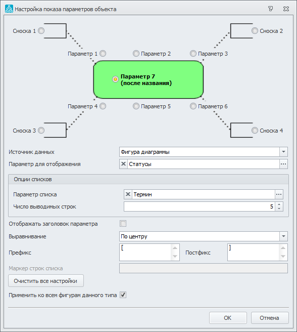 | Область вывода параметра | Задается кликом мыши в одном из предустановленных переключателей. Выбор области определяет, как будет расположен выводимый параметр относительно блока фигуры на диаграмме. В области с пометкой Сноска удобно выводить списки, а в области с пометкой Параметр - обычные параметры объекта, но данная привязка не является жесткой: можно также выводить в области с пометкой Сноска обычные параметры, а в области с пометкой Параметр - списки объекта. |