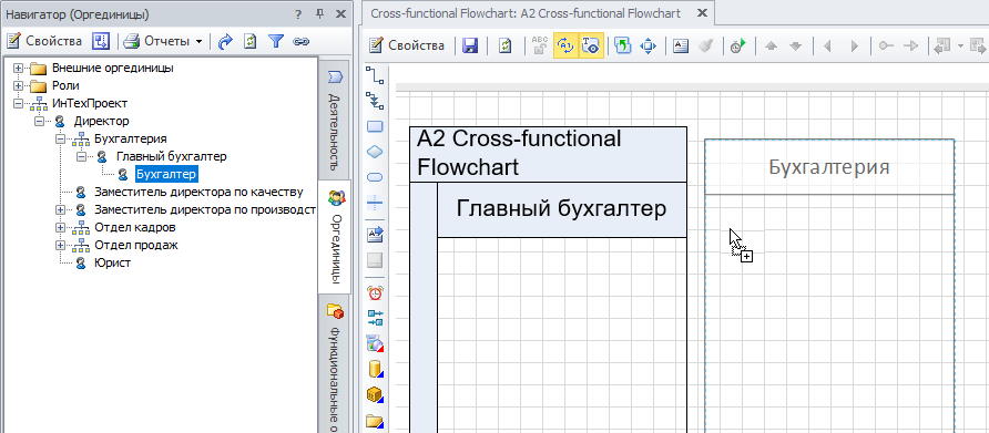 На Рис. 6 показано добавление оргединицы перетаскиванием из Навигатора на диаграмму Cross-functional Flowchart.