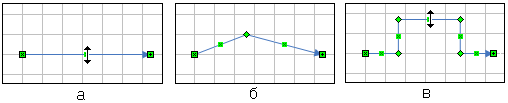 С помощью клавиш Ctrl и Shift можно произвести специальную трансформацию средней части линии стрелки. Подведите курсор к центру выделенной стрелки так, чтобы он получил вид двунаправленной стрелки. Затем, удерживая клавишу Ctrl или Shift, нажмите на левую кнопку мыши и, удерживая ее, переместите курсор мыши. На Рис. 9 показано: а - выделение средней части стрелки; б - действие клавиши Ctrl; в - действие клавиши Shift.