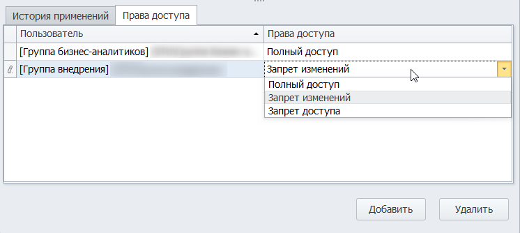 Вкладка Права доступа позволяет задавать настройки доступа к ветке для пользователей (см. Рисунок 3). Чтобы задать новое ограничение или предоставить доступ, необходимо нажать кнопку «Добавить» и выбрать пользователя или группу из Active Directory. Далее, в столбце Права доступа можно выбрать тип доступа. Кнопка «Удалить» удаляет строку.