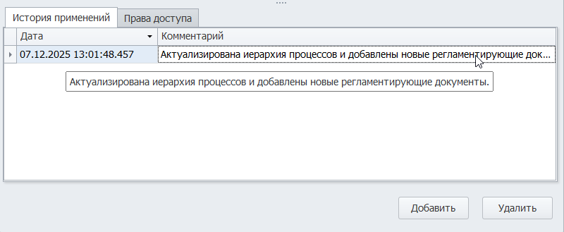 Вкладка История применений отображает перечень применений ветки (см. Рисунок 2). Дата — дата и время применения ветки. Комментарий — комментарий, введенный во время применения.