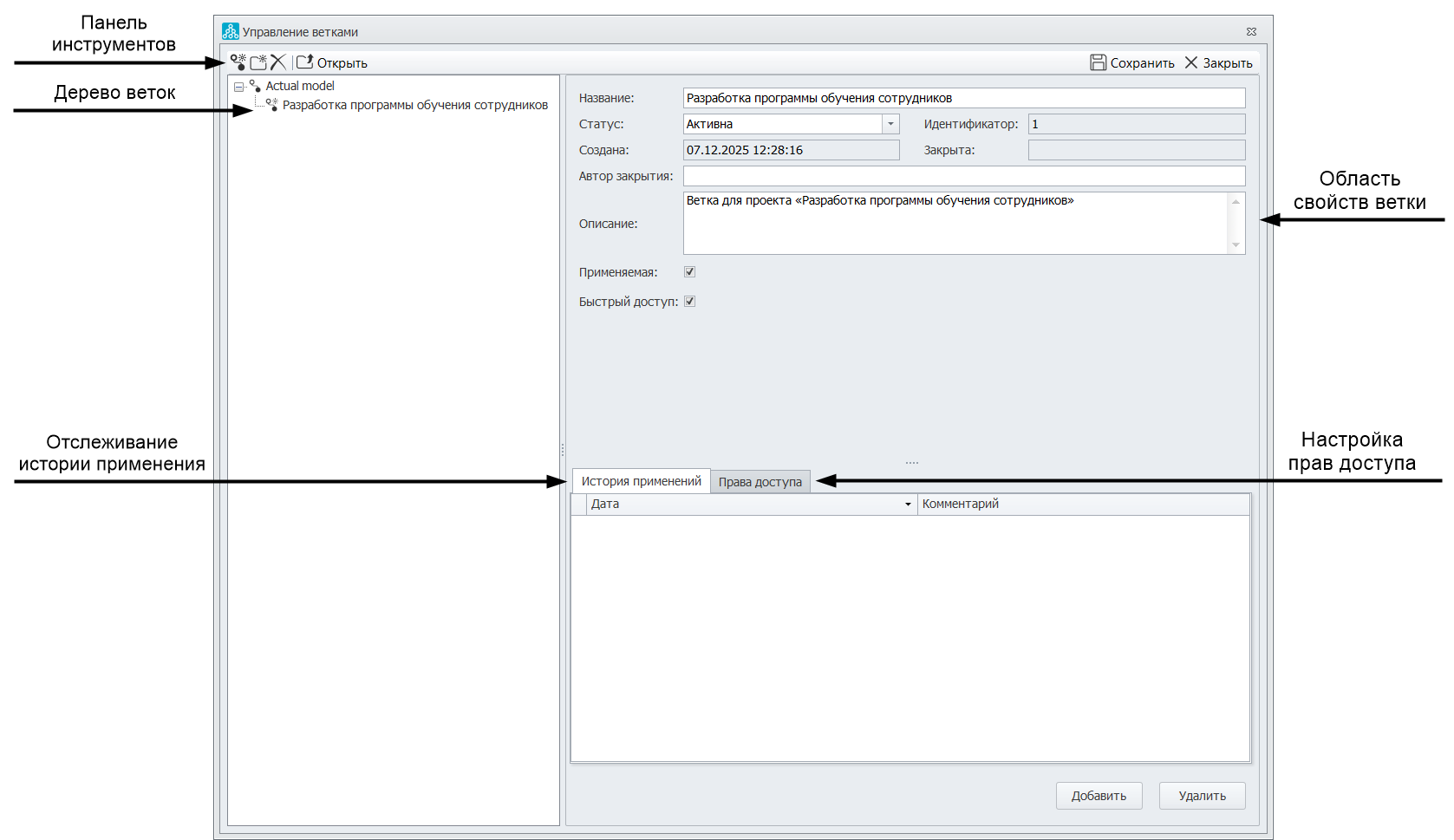 | Статус | Ветка может иметь один из двух статусов: «Активна» и «Закрыта». Статус «Закрыта» блокирует внесение изменений в ветку. При создании новой ветки ей автоматически присваивается статус «Активна». |