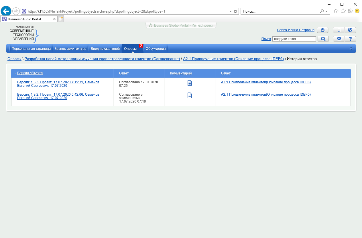 отображает, что по объекту опроса есть история ответов на предыдущие версии объекта. Нажатие на нее открывает страницу истории ответов (см. Рисунок 12).