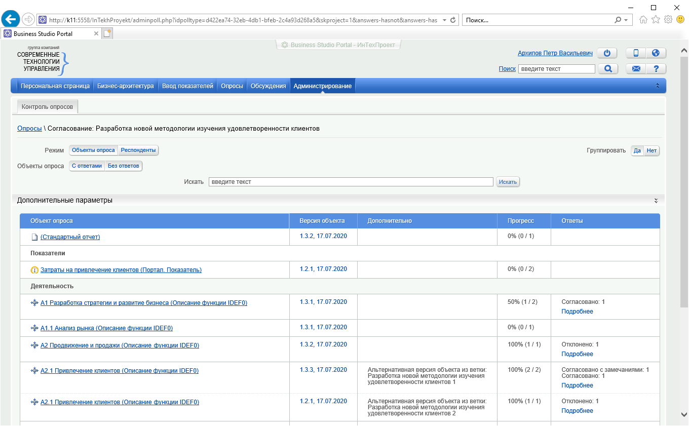 | Тестовая эксплуатация | Тип опроса, предназначенный для проведения тестовой эксплуатации бизнес-архитектуры на ограниченном списке сотрудников. |