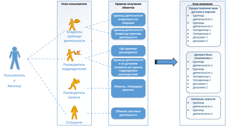 Пользователю соответствуют в организации некоторые роли, например, руководитель подразделения или обычный сотрудник. Каждая роль содержит в себе набор правил получения объектов для пользователя, физического лица с которым он связан, должности и т.д. Согласно этим правилам объекты становятся доступными пользователю в разделе портала "Бизнес–архитектура", в опросе или при контроле прохождения опроса. Подробная информация о правилах получения объектов представлена в главе Правила получения объектов.
