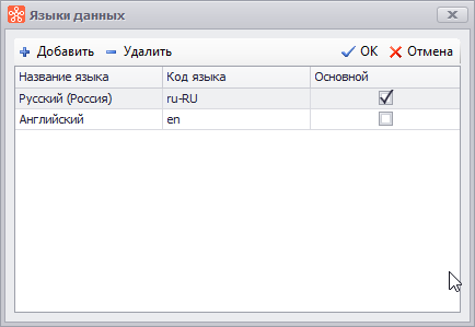 Окно редактирования языков при использовании сервера лицензий с лицензией Business Studio Ultimate (доступны добавление, удаление и смена основного языка базы данных) приведено на рисунке 1.