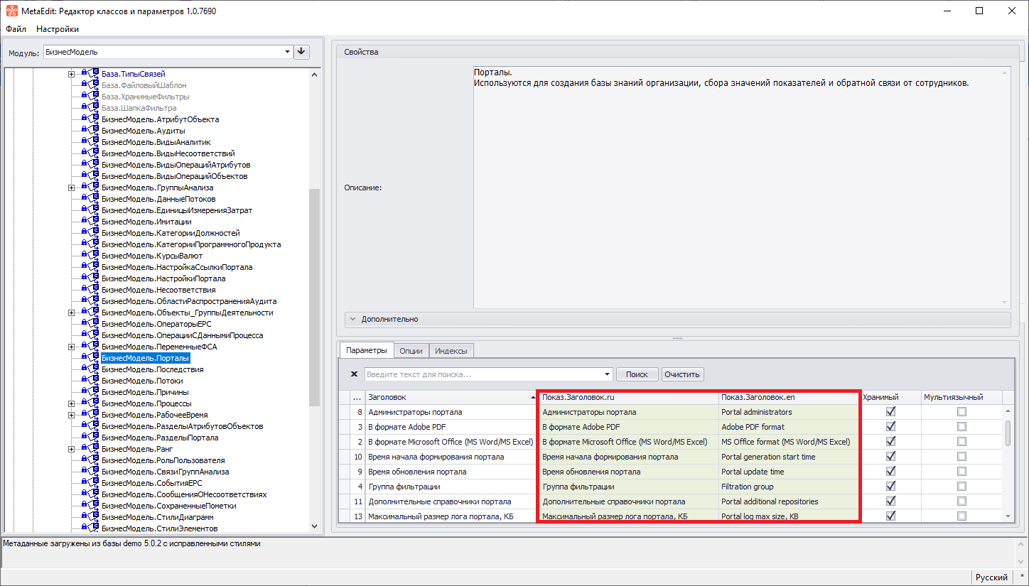 В правом нижнем углу окна можно выбрать Текущий язык. Текущий язык влияет на отображение заголовков классов в дереве (при включенной опции "Показывать заголовки классов"), а также на отображение описаний (всех типов - классов, параметров) и их редактирование.
