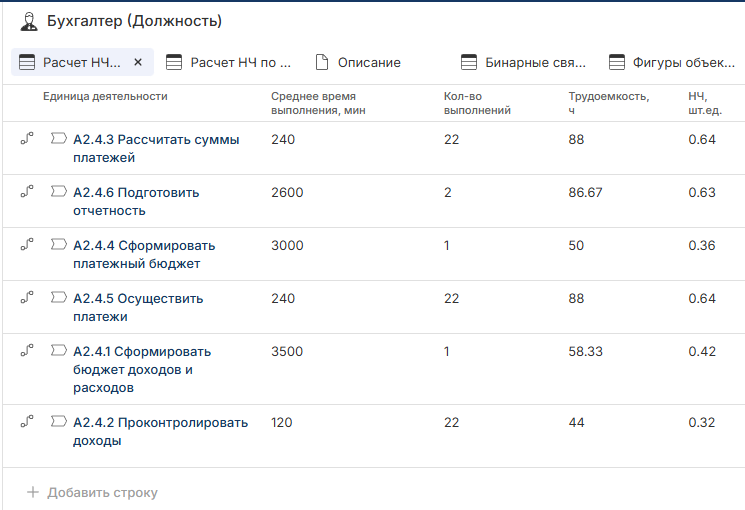Для каждой единицы деятельности указывается среднее время ее выполнения в минутах и количество ее выполнений за рассчитываемый период. Автоматически рассчитывается трудоемкость выполнения единицы деятельности в часах по формуле: