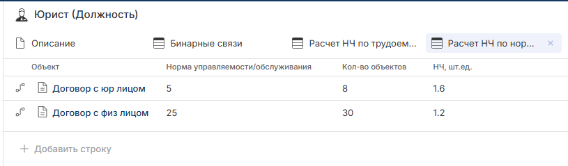 В Дополнительных свойствах должности в списке Расчет НЧ по нормам указывается перечень объектов, которые обслуживает или которыми управляет должность, их нормативное и реальное количество. Значение параметра НЧ, шт.ед. рассчитывается автоматически (Рис. 2).