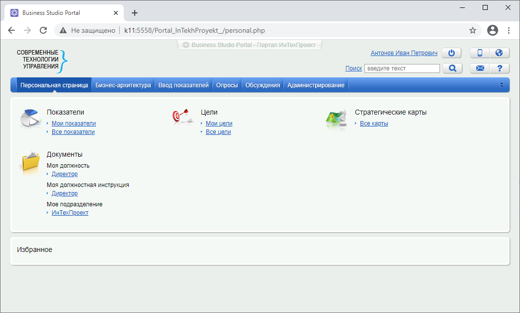 В нижней части Персональной страницы находится блок Избранное, в котором выводятся ссылки на отчеты, добавленные сотрудником в избранное в разделе Бизнес-архитектура.
