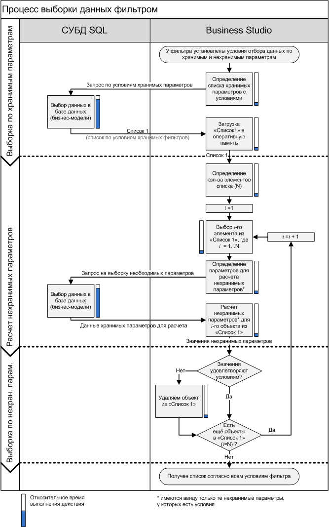 Допустим, у фильтра заданы условия по хранимым и нехранимым параметрам. Процесс выборки данных из базы будет следующий: