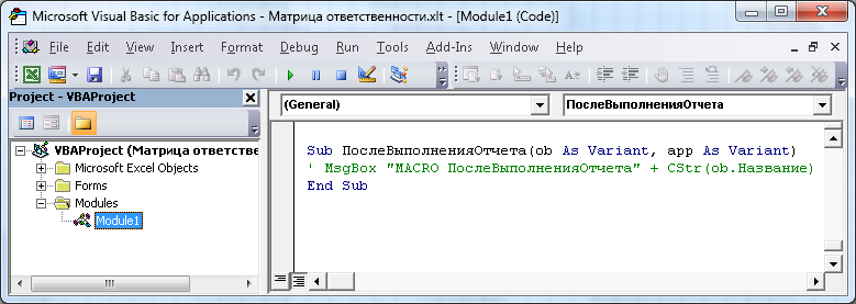 Sub ПослеВыполненияОтчета(ob As Variant, app As Variant) ' MsgBox "MACRO ПослеВыполненияОтчета" + CStr(ob.Название) End Sub