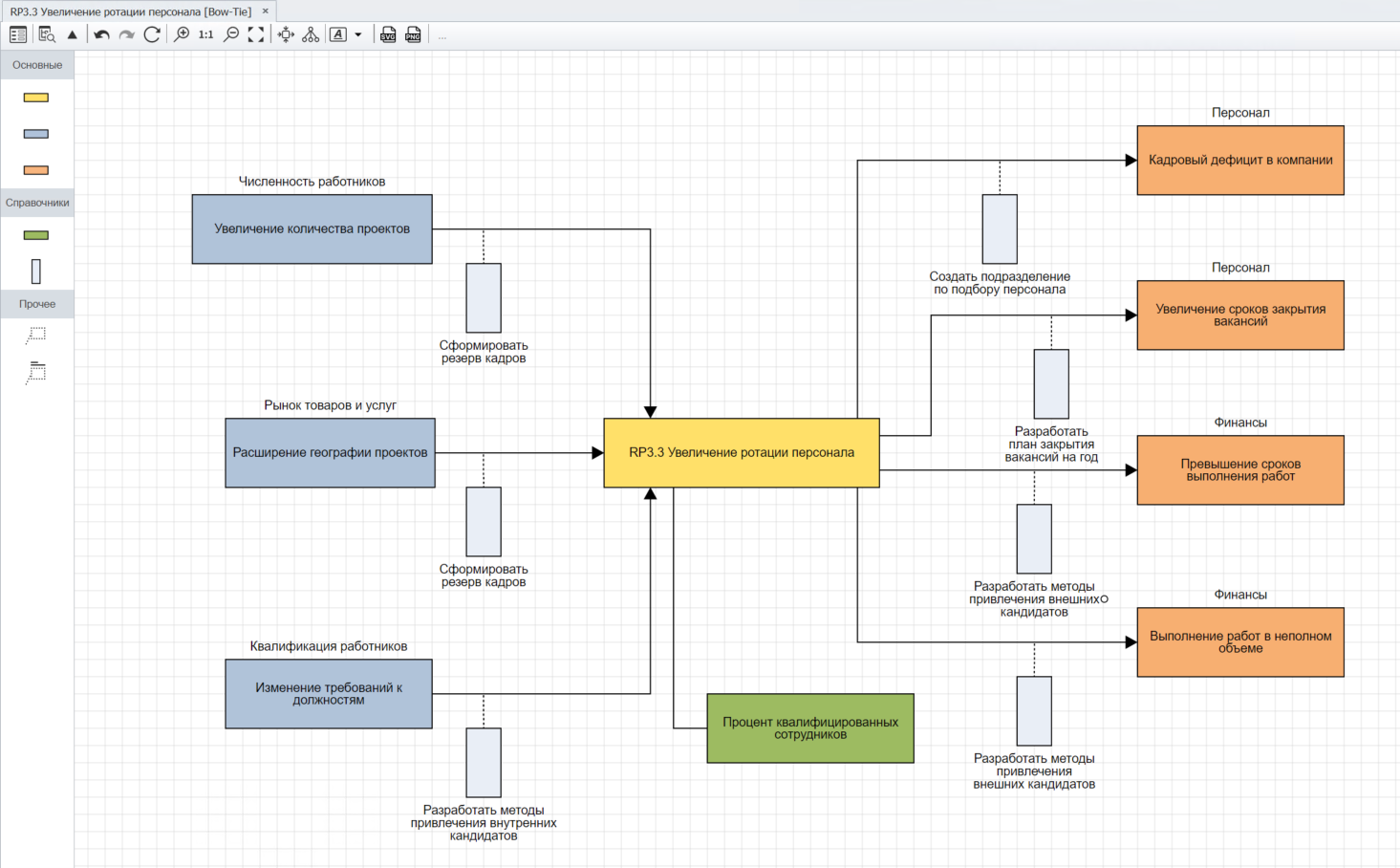 Удобным инструментом анализа причин и последствий риска является Диаграмма Bow-Tie. Эта диаграмма позволяет наглядно представить все причины и последствия риска и выработать мероприятия по уменьшению вероятности возникновения риска и тяжести проявления последствий риска.