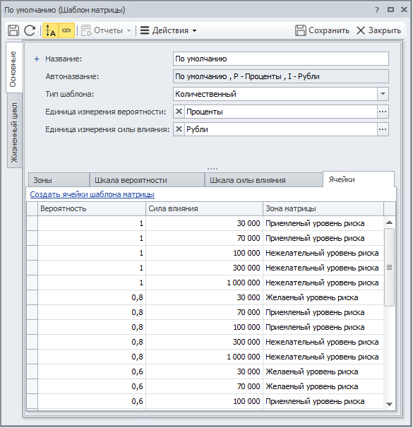 Матрица рисков строится на основе шаблона матрицы. Шаблон матрицы создается в одноименном справочнике (Главное меню → Риски → Шаблоны матрицы), где выбирается тип шаблона (качественный или количественный), настраиваются цвета зон матрицы (рис. 1).