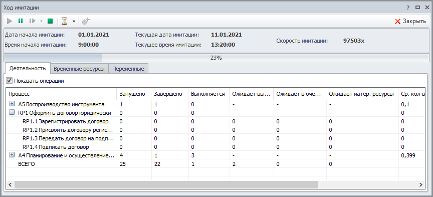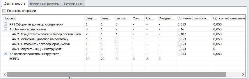 На вкладке Процессы (Рис. 2) представлен перечень имитирующих процессов и информация об экземплярах имитирующих процессов. Чек-бокс Показать операции предназначен для отображения наименований имитирующих операций и информации об их экземплярах.