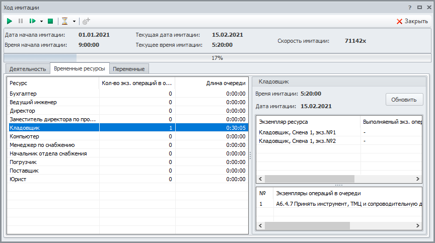 На вкладке Временные ресурсы (Рис. 3) представлен перечень имитирующих временных ресурсов, экземпляры которых участвуют при выполнении экземпляров имитирующих процессов. При выделении наименования имитирующего временного ресурса в правой части вкладки отображается детальная информация о состоянии имитирующего ресурса и его экземпляров на момент выделения.