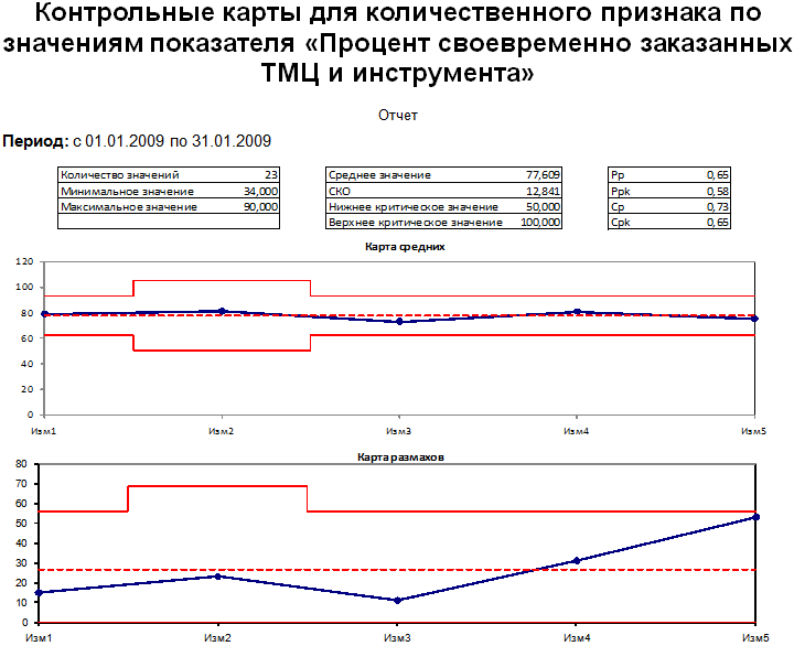 Контрольные карты, построенные по значениям показателей, позволяют отслеживать состояние процесса во времени и, главное, воздействовать на процесс до того, как он выйдет из-под контроля. Контрольные карты в системе Business Studio строятся в соответствии со стандартом "ГОСТ Р 51814.3-2001 Методы статистического управления процессами".