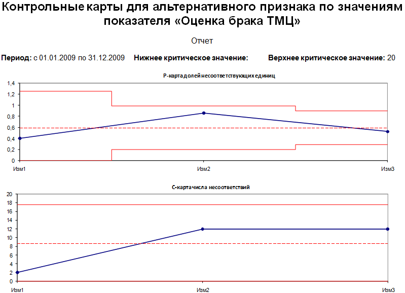 Пример построения отчета "Контрольная карта для альтернативного признака" приведен на Рис. 9. В отчете по измерениям одного показателя с учетом периода, указанного в Настройках пользователя (Главное меню → Главная → Настройки пользователя → вкладка Дополнительно), строятся все четыре карты: