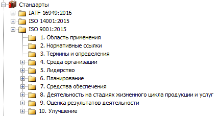 В этом справочнике по умолчанию приведены требования с текстами неофициальных изданий таких стандартов как: ISO 9001:2015, ГОСТ ISO 9001-2011, ISO 9001:2008, ISO/TS 16949:2009 и ISO 14001:2015. При возникновении необходимости построить систему управления, соответствующую требованиям другого стандарта, папку этого стандарта и его требования всегда можно добавить в этот справочник.