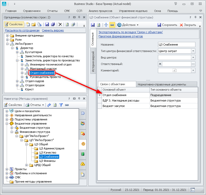 Затем для каждого объекта указываются относящиеся к нему объекты организационной структуры. Для этого из справочника "Оргединицы" методом Drag&Drop необходимые объекты переносятся на вкладку Связи с объектами объекта финансовой структуры (Рис.2). Таким образом, при формировании финансовой структуры организации в Business Studio применяется принцип "один ко многим", то есть каждый объект финансовой структуры связан с одним или более объектами организационной структуры. Такой подход позволяет увязывать воедино организационную ответственность руководства с финансовой ответственностью, что не всегда возможно в случае разделения одного подразделения на несколько ЦФО.