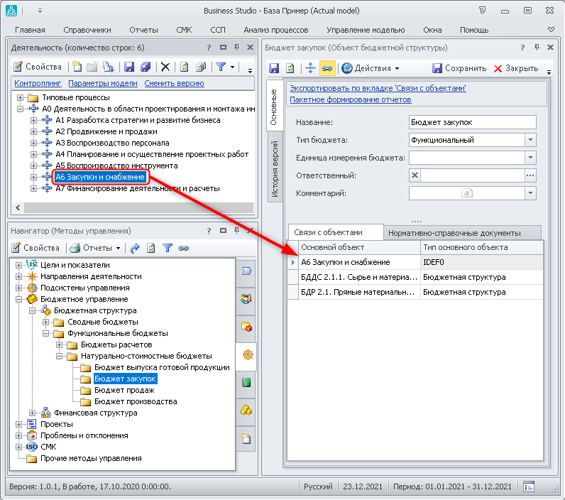 Затем процессы, относящиеся к данному функциональному бюджету, сопоставляются с самим бюджетом, путем перетаскивания объектов из справочника "Деятельность" на вкладку Связи с объектами в Окне свойств функционального бюджета (Рис.4).