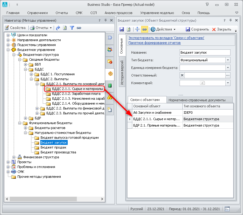 | 8. | Сформировать структуру статей функциональных бюджетов. Для этого: - заполнить список "Связи с объектами" каждого функционального бюджета статьями сводных бюджетов. | Информация используется для формирования подразделов 2.2. Функциональные бюджеты и 2.3. Операционные бюджеты ЦФО раздела 2. Бюджетная структура организации. |
