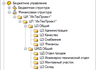 Финансовая структура организации в Business Studio может быть представлена иерархией папок в группе справочников Финансовая структура (Методы управления −> Бюджетное управление). Структура папок формируется в соответствии с разработанной моделью финансовой структуры (Рис.1).